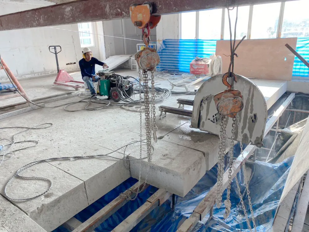 งานตัดคอนกรีตด้วย WALL SAW เครื่องตัดผนัง (Wall Saw) สำหรับตัดผนังเพื่อทำประตูลิฟต์ ขยายประตู หรือชิ่งเปิดต่างๆ โดยการยึดรางกับผนังแล้วติดตั้งเครื่องตัดติดกับราง ใช้รีโมทบังคับการตัด